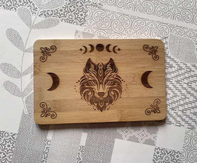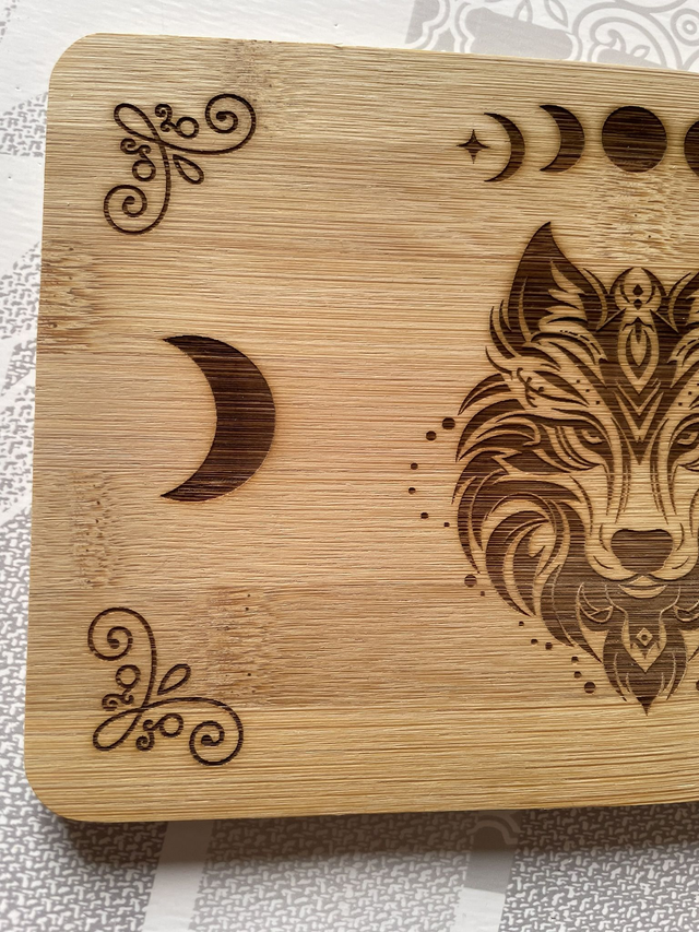 🌙Planche Petit Déjeuner en Bambou – Gravure Loup et phases de la Lune